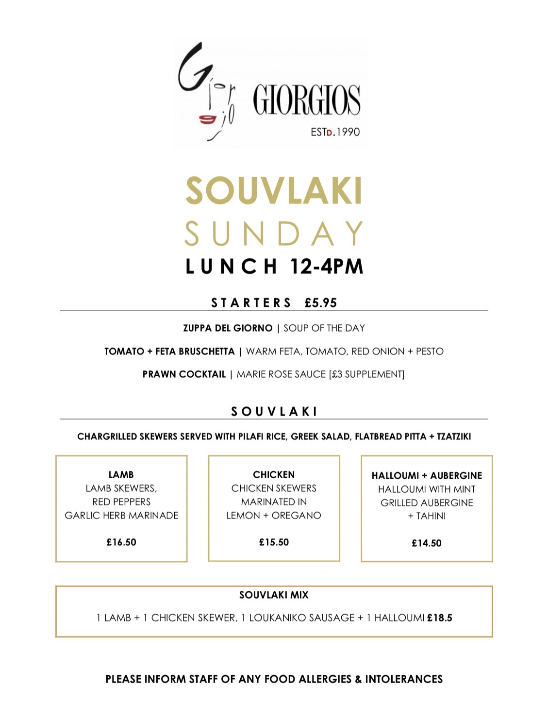 Sundays at Giorgios are all about relaxed dining, good company, and the flavours we grew up with. Whether you’re after a classic chicken souvlaki, marinated lamb, or halloumi, it’s the perfect way to end the week on a delicious note.